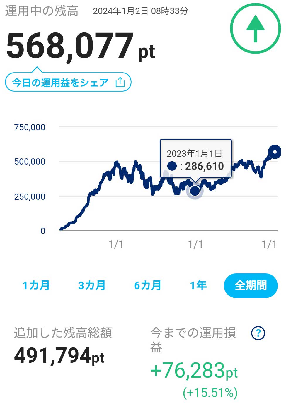 PAYPAYポイント運用中のポイントは1月1日の時点で、56万。ほとんどチャレンジコース(Direxion SP500 ブル三倍)に投資している。