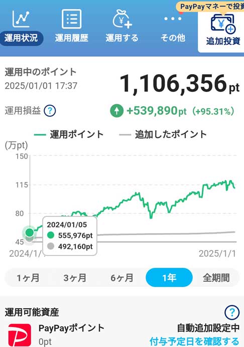 PAYPAYポイント投資が110万程度。前年50万くらいだったので、倍ぐらいになっている。自分が追加したポイントは7万ぐらい。銘柄はほとんどSPXLだが、サービスには去年QQQとTQQQが追加されている。最近TQQQに2万ポイントぐらい入れたけど、思いっきりマイナス転落した。大体俺が投資すると暴落しやがる